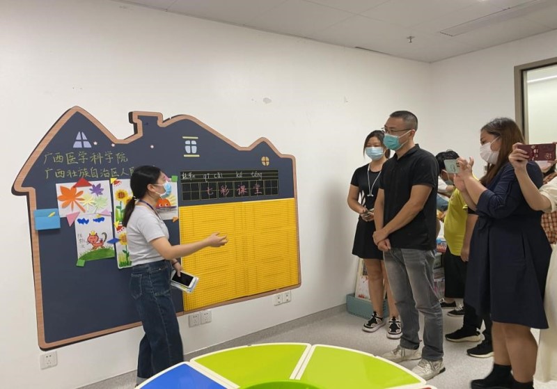 26日,与会嘉宾一行来到广西医学科学院·广西壮族自治区人民医院东院参观考察“七彩课堂——住院儿童关怀成长计划”项目。该课堂由社工部联合儿科及“医路有你”医务社工大病救助项目组,以医务社工联动志愿者的形式,定期为儿科的住院儿童及其家庭开展系列关怀课堂活动,是广西区内第一家“病房课堂”。考察团队通过实地观摩一节“七彩课堂”小组活动,加深了对医务社会工作方法、技巧在实践运用中的认识。